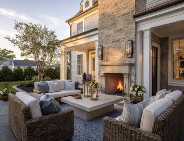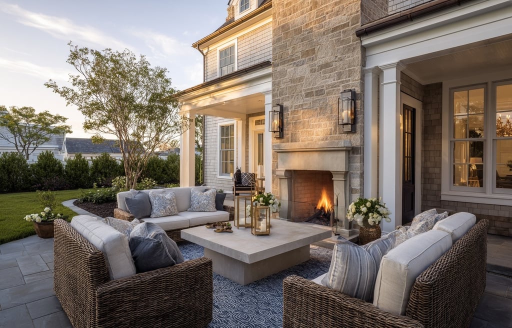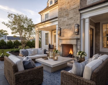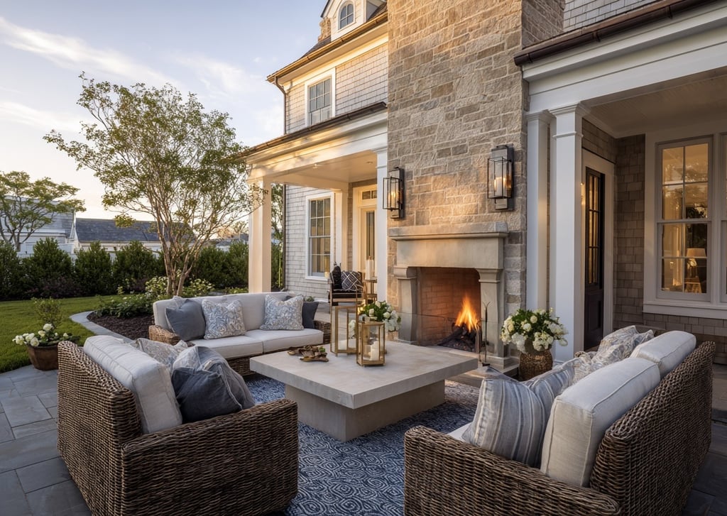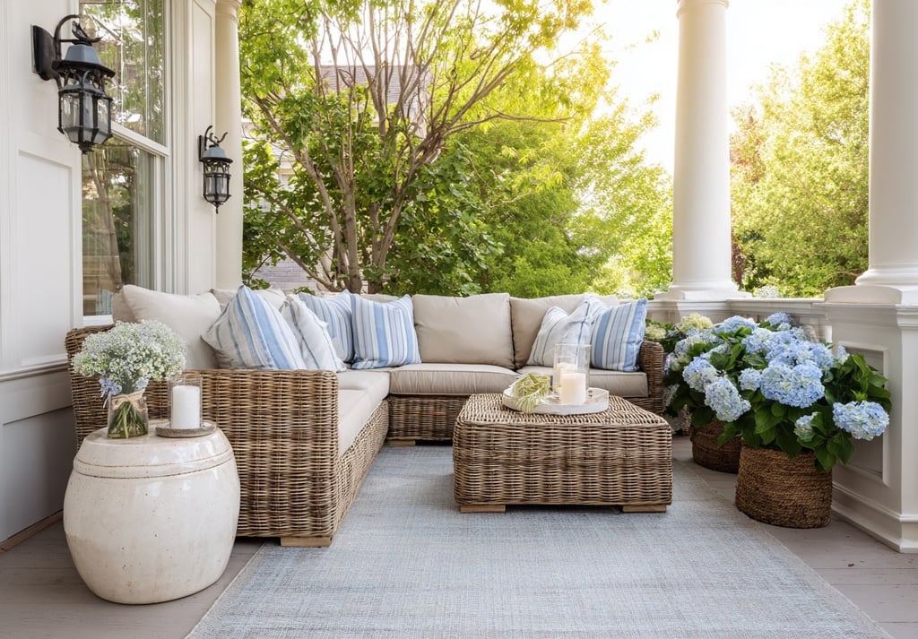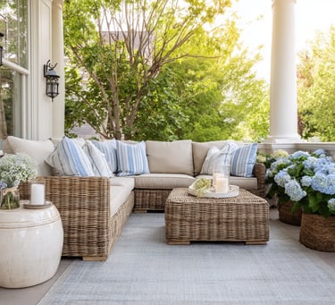 A covered veranda or garden patio becomes the most used space in the home — and styling it thoughtfully makes all the difference. Start with woven seating in rattan or wicker. Keep cushions neutral, then layer in soft blue stripes or subtle botanical patterns. Add a textured outdoor rug to ground the space, and finish with lanterns for warmth at dusk.