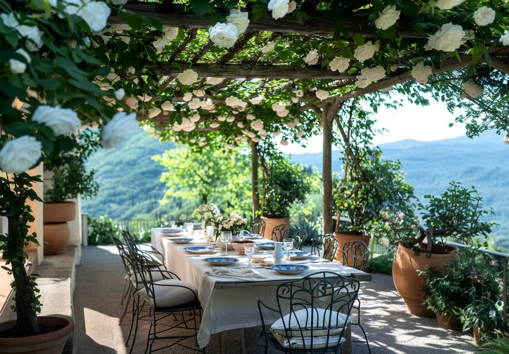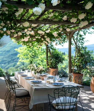 A long linen-covered table beneath climbing roses.