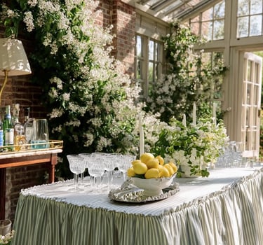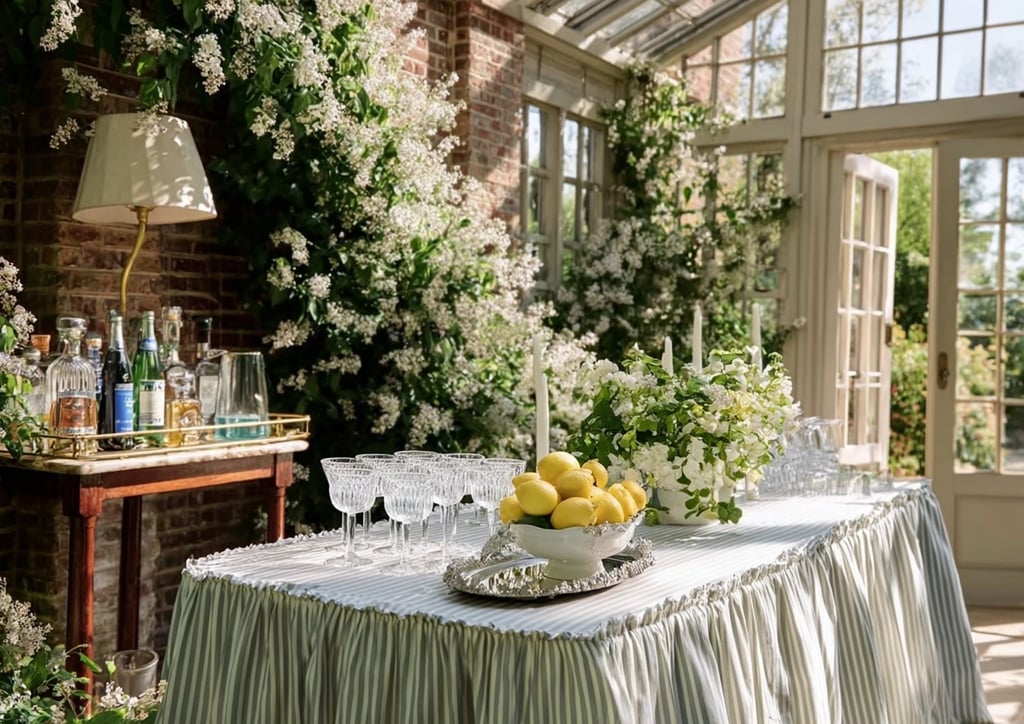 A long table draped in striped linen. Crystal glasses catching the afternoon light. A bowl of lemons or limes for a simple seasonal touch. Blue-and-white ceramics bring heritage charm without feeling formal.
