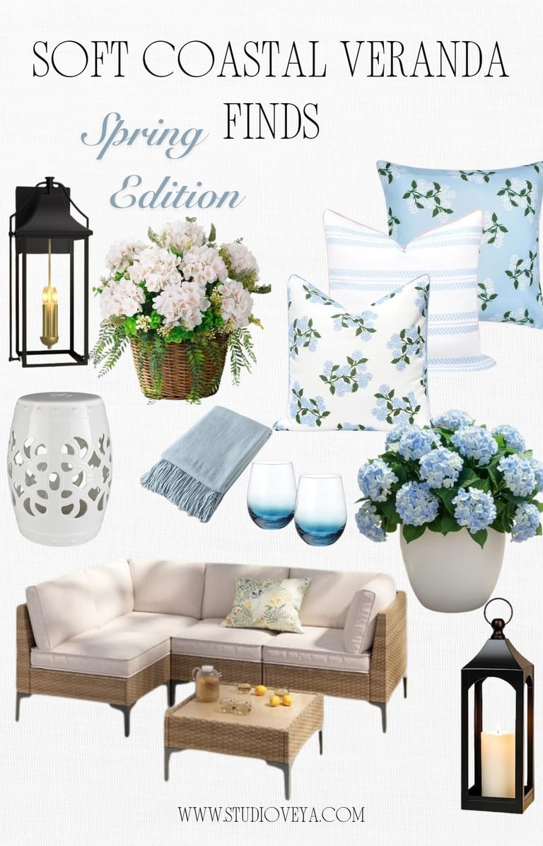Coastal spring decor ideas with hydrangeas, wicker seating, striped linens and relaxed outdoor entertaining inspiration. Shop the full seasonal edit and curated finds.
