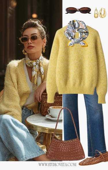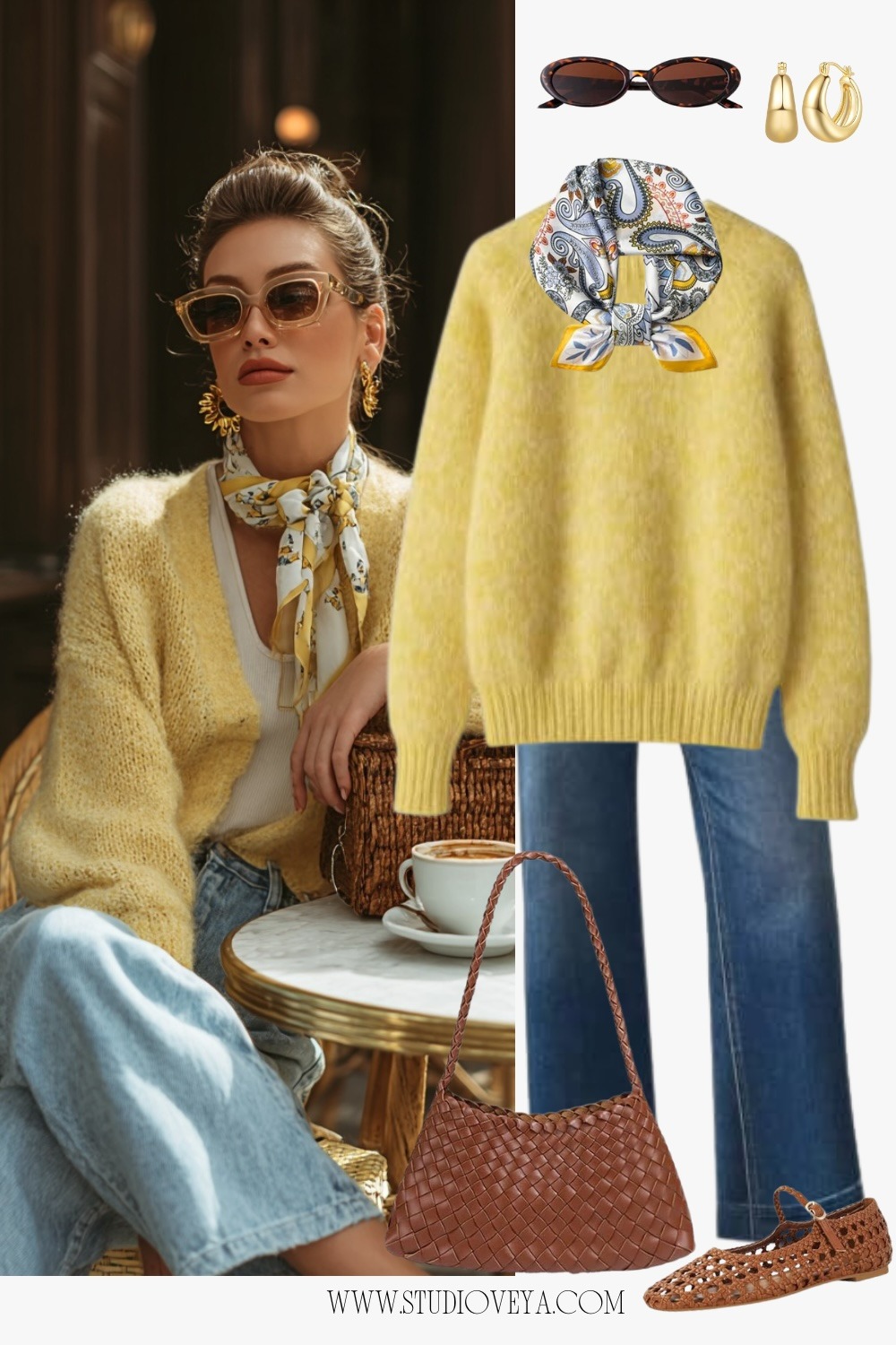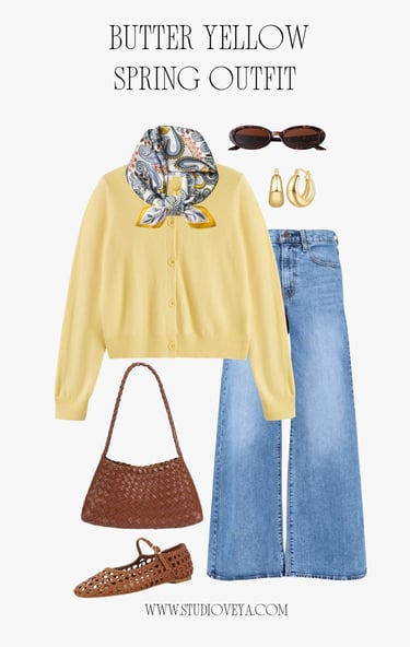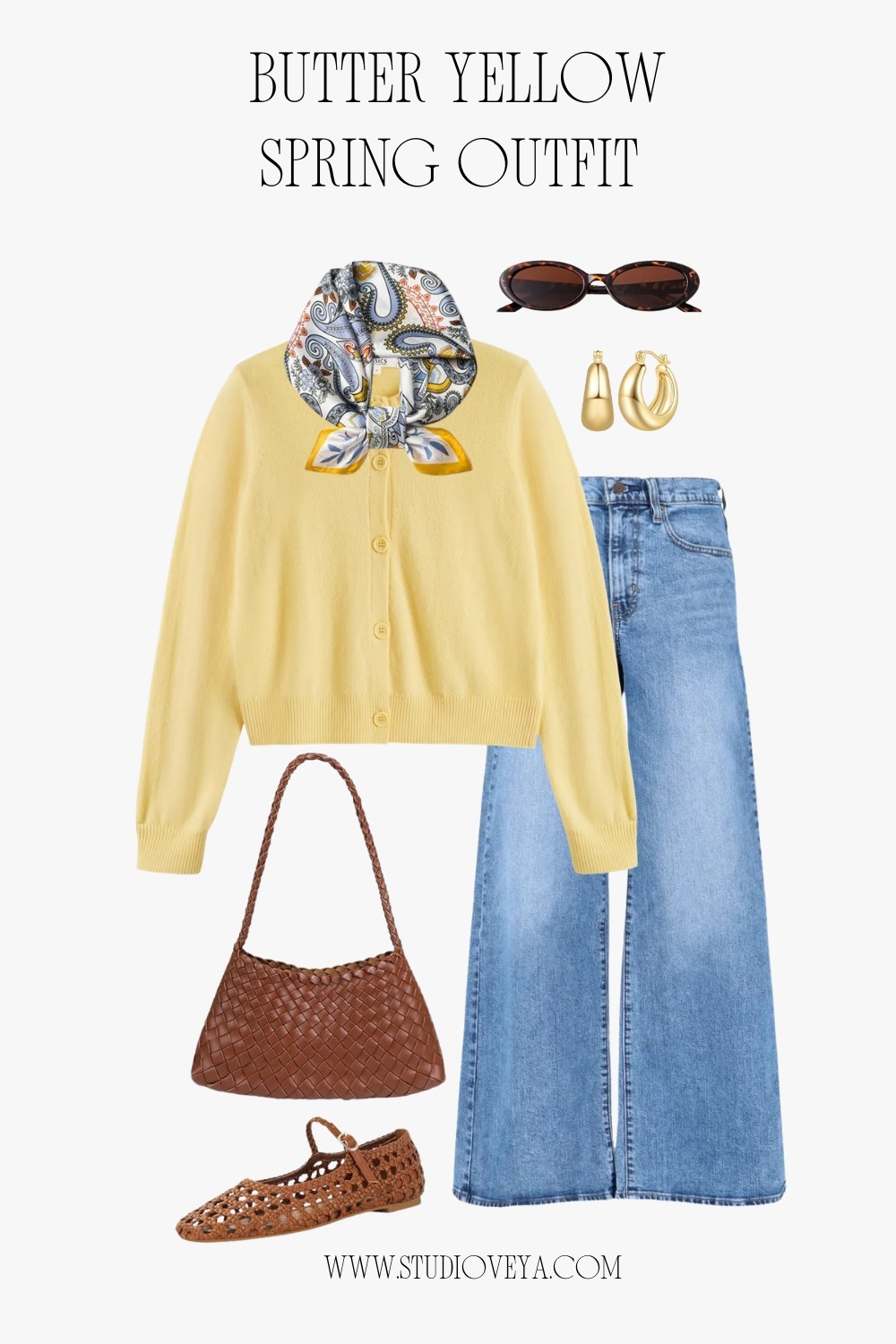 This butter yellow spring outfit pairs soft pastel colour with relaxed denim for an effortless everyday look. Light knits, woven accessories and classic denim create an easy outfit that feels fresh for the season.