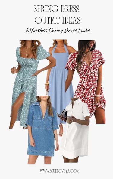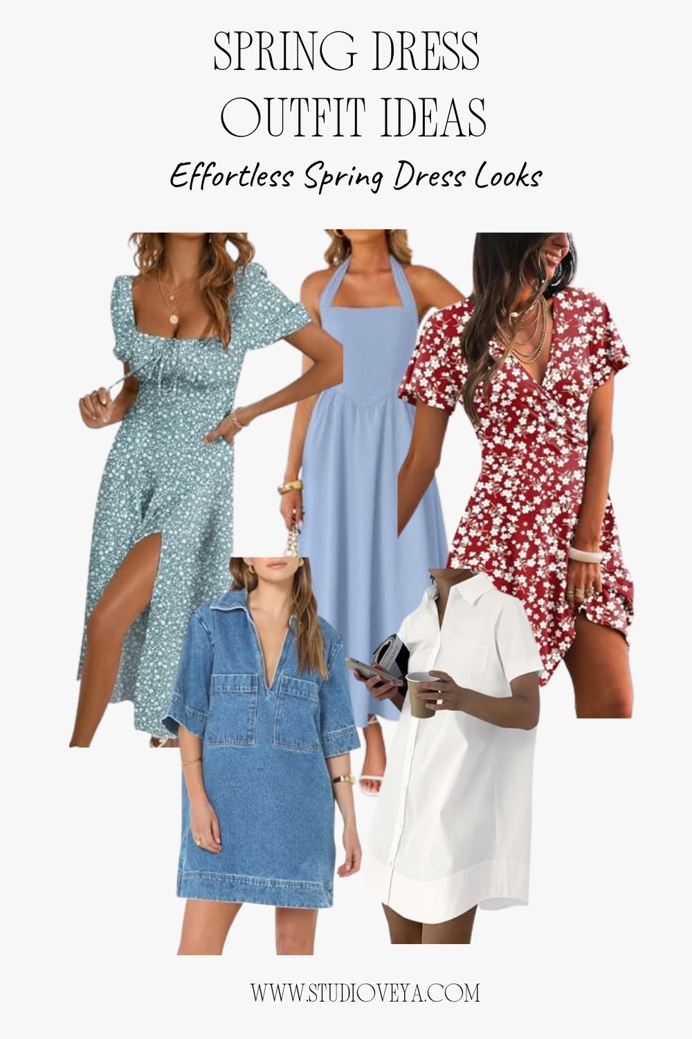 Explore the collage below to discover spring dress outfit ideas and shop similar pieces through the links provided. You can also find more dresses, accessories, and styling options in the Studio Veya Amazon Storefront.