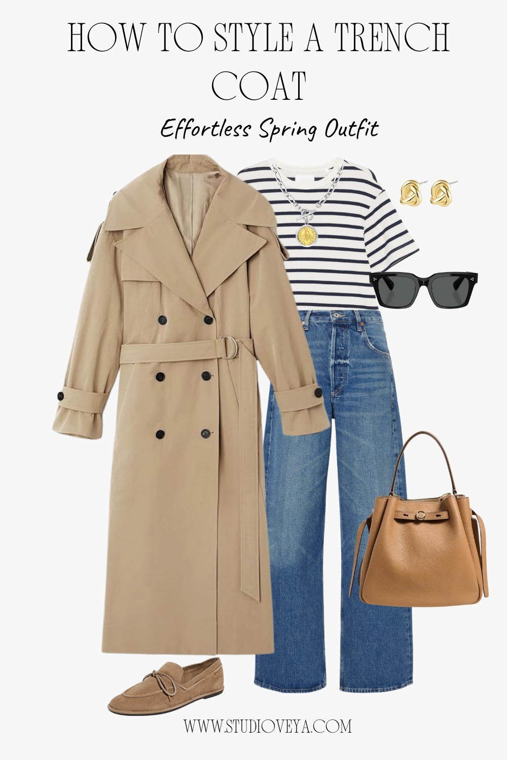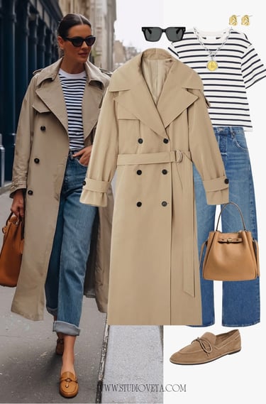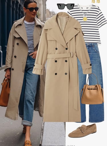 A timeless trench coat is the ultimate spring layering piece. Paired with classic denim and a striped shirt, it creates an easy outfit that feels effortlessly chic for everyday wear. Neutral leather accessories and minimal jewellery keep the look polished while still relaxed enough for casual days.