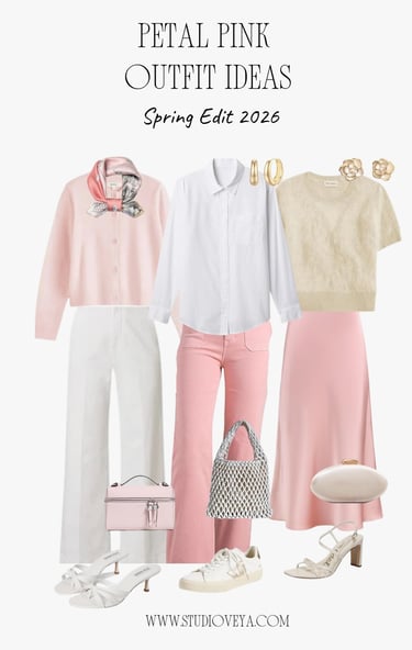Soft petal pink tones bring a gentle and feminine touch to spring outfits. From breezy dresses to delicate accessories, this colour adds warmth and elegance without feeling overpowering. Paired with neutral shoes, woven bags, and simple jewellery, petal pink pieces create effortless looks that feel fresh and polished for the season.