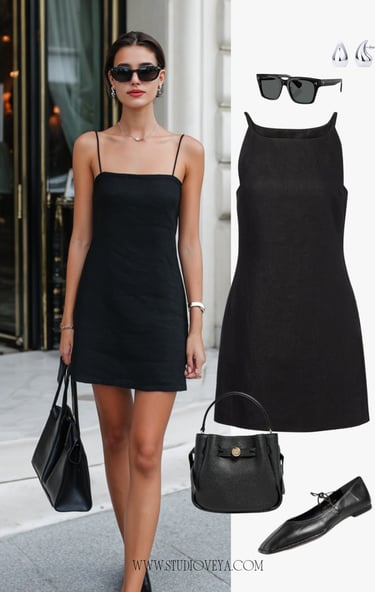 1. Black Dress 2. Black Sunglasses 3. Bucket Bag 4. Earrings 5. Black Flats 6. Linen Shirt 7. Linen Pants 8. Straw Bag 9. Woven Flats 10. Brown Sunglasses