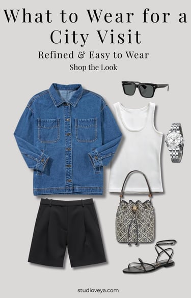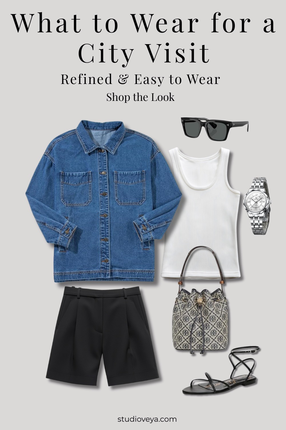 A simple top paired with tailored shorts or trousers, layered with a lightweight jacket or denim shirt, creates a look that transitions seamlessly from day to evening. Accessories like a structured bag and classic watch add a subtle sense of polish.