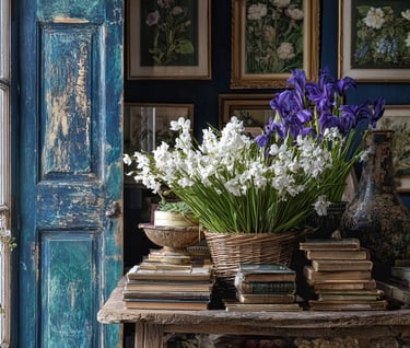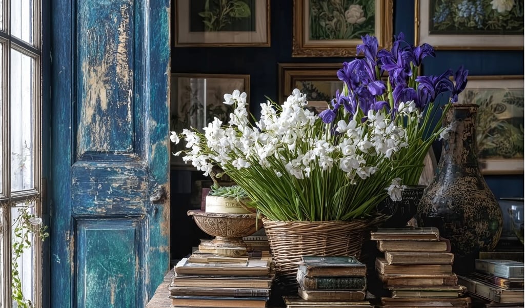Weathered wood, vintage books, and botanical art provide a timeless backdrop for baskets of white and purple flowers. This look is about patina and personality — the balance between lived-in rusticity and elegance.