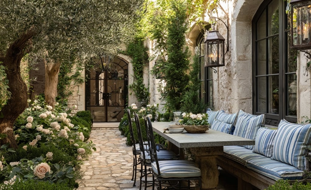 Outdoor spaces also benefit from the blue and white treatment. Here, a French-inspired patio blends striped cushions, wrought iron chairs, and lush greenery to create an atmosphere that feels both relaxed and refined. It’s proof that interiors and exteriors can share the same colour language.
