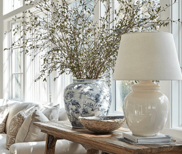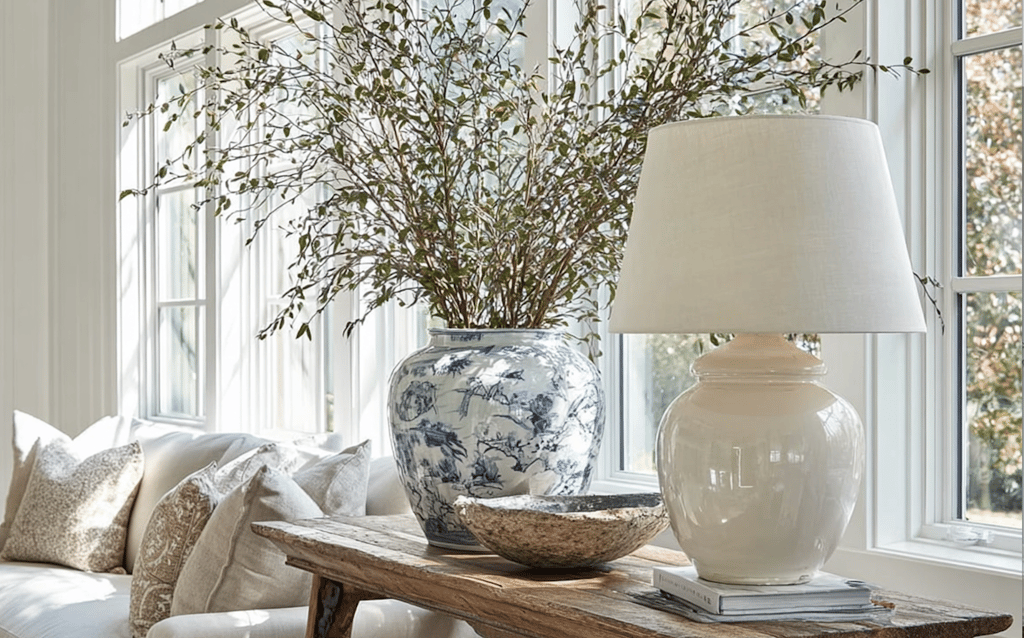 Nothing says timeless blue and white like chinoiserie ceramics. From ginger jars to temple vases, these pieces instantly elevate a console table, sideboard, or entry. Layering them with books or framed art makes them feel integrated rather than ornamental.