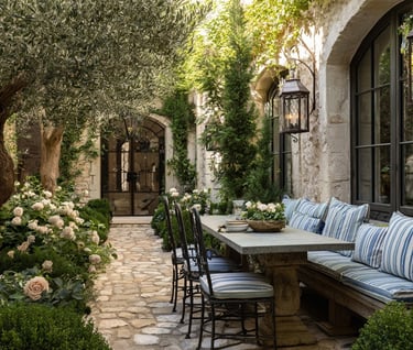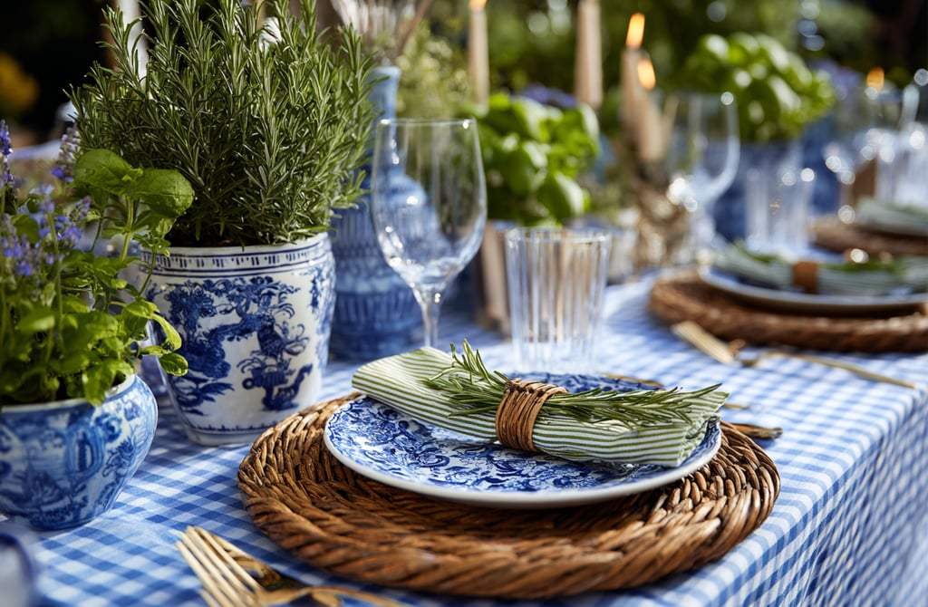 On the table, classic blue-and-white gets a refreshing lift from green accents. Woven textures, striped linens, and potted herbs bring a natural elegance that feels both timeless and welcoming. Perfect for outdoor dining that blends sophistication with ease.